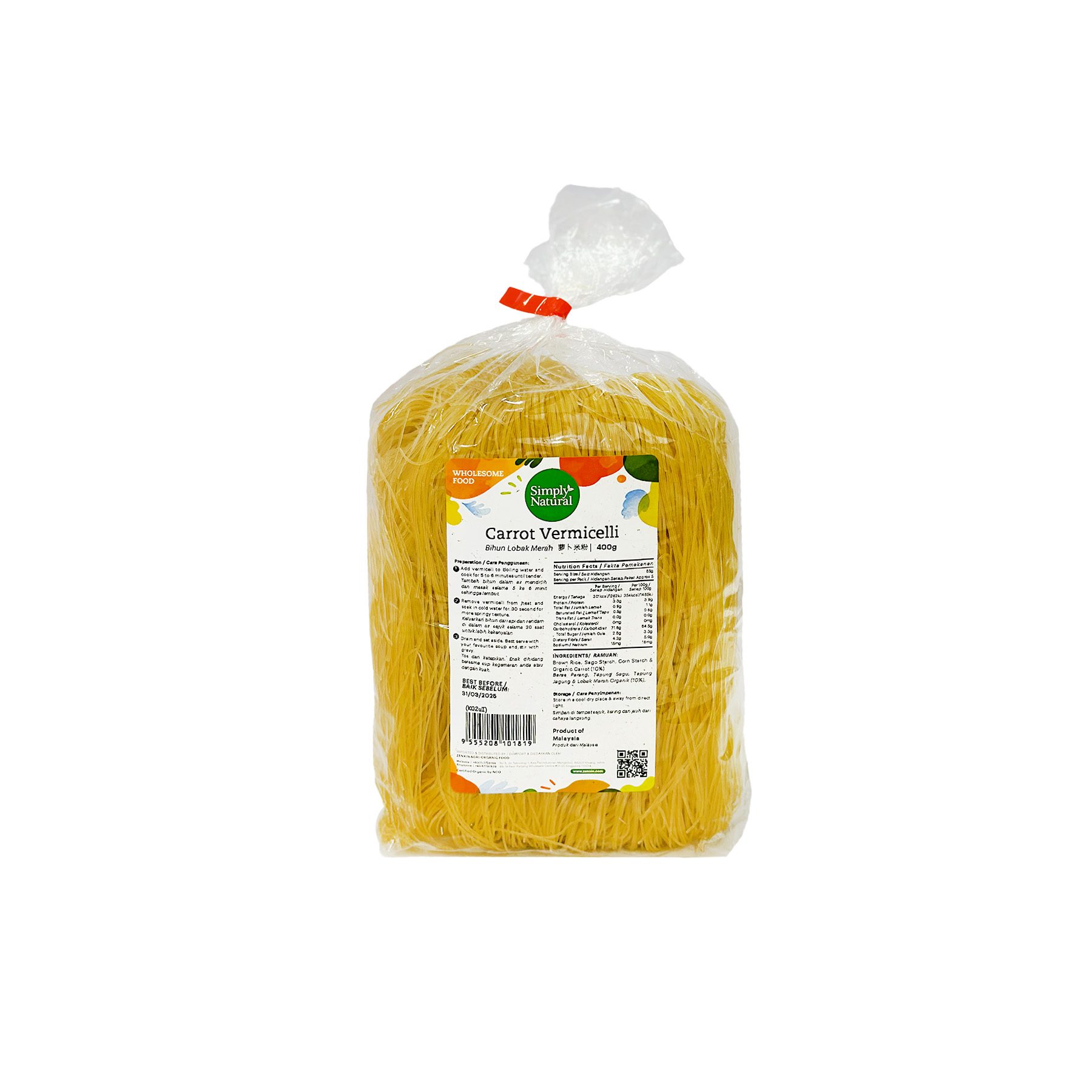 Delicious gluten-free vermicelli made with organic carrot and sago starch. Natural carrot flavour. Rich in vitamin A & beta-carotene, boots nutritional intake. Can be used in stir fry dishes, soups and salads.